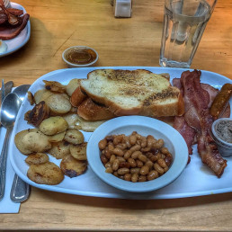 Avec deux œufs, fèves au lard, patates rôties maison et pain croûté cuit sur le poêle. / with two eggs, baked beans, homemade roasted potatoes, and crusty bread baked on the stove.