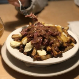 Les frites au four, fromage en grains St. Guillaume (gros morceaux.) sauce poutine maison et porc effiloché à l’ail. / La Binerie's Our oven-baked fries, St. Guillaume cheese curds ( large pieces ), homemade poutine sauce, and pulled-pork.