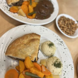 Ragoût de boulettes, tourtière, purée de pommes de terre, légumes saisonniers, fèves au lard et pouding chômeur/ Meatball stew (ragoût), meat pie (tourtière), mashed potatoes, season vegetables, our baked beans and poor man’s pudding.